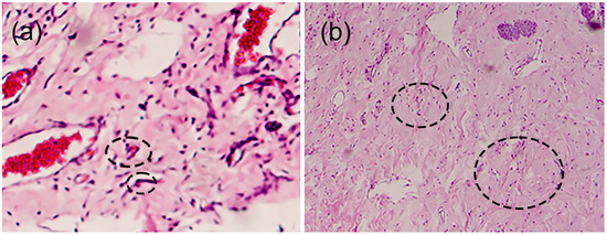 Histological appearance of samples showing (a) angiogenesis and (b) fibrogenesis. Circles in the images indicate examples of angiogenesis and fibrogenesis, respectively.