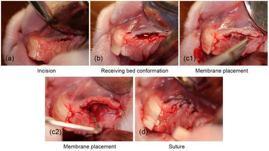 The surgical procedure for the placement of the cellulose hydrogel film. (a) Surgical incision, (b) conformation of the surgical place, (c1,c2) placement of the hydrogel, and (d) suturing.