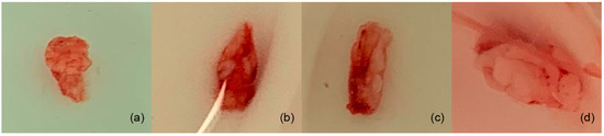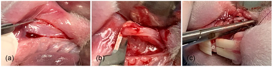 Tissue samples were taken from 4 specimens in the area where the biomaterial was implanted, and from another 4 specimens, tissue samples were taken from the areas where only the surgical site was formed (at weeks 4, 8, 12, and 16 after implantation and formation of surgical site) (Figure 4–c) [34,36]. In addition, tissue samples were also taken from the diastema areas of the left upper jaw (no previous procedure was performed in that area), at the same time that the tissue samples were taken (Figure 5a–d) from the membrane and surgical groups.