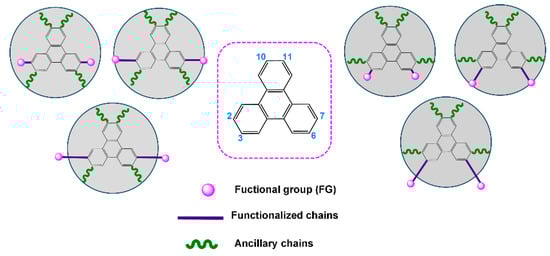 General description of triphenylenes based on a three-block molecular architecture, terminally functionalized at different positions ((left): 2,7; (right): 3,6). Pink: functional group; violet: functional chains (alkoxy chain bearing FG at the free end); green: ancillary chains. The schematic representation emphasizes the position of the FG relative to the “crown” (grey circle) formed by the disordered ancillary chains, (center): numbering scheme.