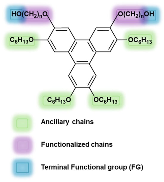 Triphenylenes have been widely studied as building units for soft materials, such as liquid crystals [,,], gels [,,], thin films [], polymers [,,], etc. They exhibit interesting molecular and self-assembling properties, whose potential increases when they are based on a multi-block molecular architecture [,,]. Indeed, the presence of terminal functional groups (FGs) at the free end of some of the aliphatic chains surrounding the core of 2,3,6,7,10,11-hexa(alkoxy)triphenylenes (Figure 1) provides, on the one hand, the key for their incorporation into macromolecular systems, like linear [,], branched [,], or cross-linked polymers []; on the other hand, it allows for the development of intermolecular interactions (FG–FG, FG–solvent, FG–support), eventually leading to specific materials, such as LC [,], LB films [], gels [,,], etc. However, synthetic aspects associated with this molecular architecture often become a barrier for the preparation of multi-block triphenylene-based novel materials. Among other strategies developed to overcome this difficulty, recent suggestions of simple and robust synthetic pathways for some key precursors [,,] contributed to paving the way.
