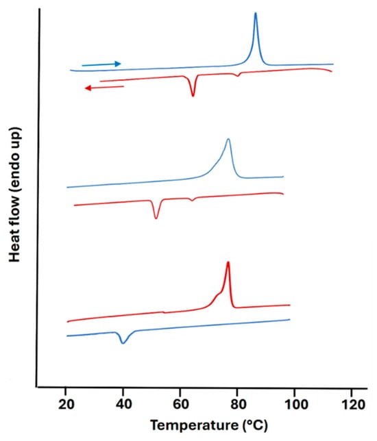 DSC traces of the second heating–cooling cycles for 3,6-THTP-DiCnOH (top: n = 4, middle: n = 6, bottom: n = 10).