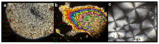 POM pictures taken on cooling from the isotropic state for the studied 3,6-THTP-DiCnOH compounds: (a): n = 4 at 78 °C, (b): n = 6 at 62 °C, (c): n = 10 at room temperature.