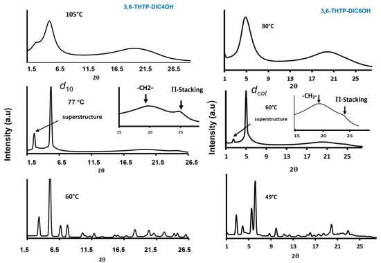 The mesomorphic properties of the three compounds under investigation were examined using polarized optical microscopy (POM), differential scanning calorimetry (DSC), and variable-temperature X-ray diffraction (XRD) through small-angle X-ray scattering/wide-angle X-ray scattering (SAXS/WAXS). These studies are summarized in Figure 3, Figure 4 and Figure 5; thermal and structural details are given on Table 1. As can be seen, both the 3,6-THTP-DiC4OH and 3,6-THTP-DiC6OH compounds exhibited monotropic columnar mesophases, whereas the heavier 3,6-THP-DiC10OH homolog proved to be non-mesogenic. DSC traces of the two lightest homologs showed one endothermic peak on heating and two exothermic peaks on cooling. POM observations in the temperature range between the two exothermic peaks detected on cooling are typical of columnar mesophases, in agreement with XRD patterns, which exhibit one narrow peak near 2θ = 5° associated with intercolumnar distances (dcol), a wide halo at ca. 2θ = 19° typical of molten aliphatic chains, and a peak at 2θ = 25° assigned to intra-columnar π−stacking distances. Both compounds exhibited an additional weak peak at small angles, assigned to a superstructure, as discussed below. A full list of the peaks detected in the diffractograms of n = 4 and 6 compounds in both the solid and LC phases is given in Table S1; an additional comparison is performed in Figure S4.