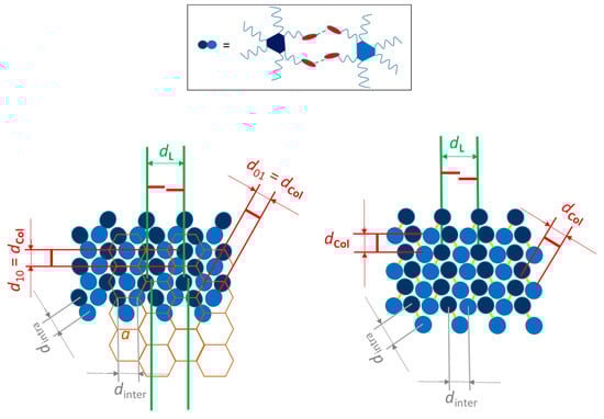 The most intense peak in the diffraction patterns of the Col mesophases found for 3,6-THTP-DiC4OH and 3,6-THTP-DiC6OH, labeled dcol, is certainly associated to the intercolumnar arrangement of the stacked triphenylene units; in a strict hexagonal array of identical columns with intercolumnar distance a, it corresponds to the 10 or 01 planes (with d10 = d01 = 0.5√3.a). The presence of a weak peak (labeled dL) associated with a distance twice that of dcol for 3,6-THTP-DiC4OH points to the presence of some kind of superstructure, in which vicinal columns are no longer identical, although similar. This feature can easily be understood when looking at the molecular structure of the studied compounds, where H-bound dimers are likely expected. This kind of arrangement, depicted in Figure 6 (left), gives rise to molecules differing just in orientation, in such a way that the electronic density along the material varies essentially with a periodicity compatible with one molecular diameter, but is slightly modulated by the dimeric association, thus yielding a superstructure characterized by a structural parameter (dL) twice that associated to the molecular diameter (d10 = dCol = 0.5√3a), as shown in Figure 6 (left). This kind of organization is known in the CLC field as “lamello-columnar mesophases” ColL or LamCol []. The fact that dL = 2dCol requires the interdimeric distance (dinter) to be identical to the intradimeric one (dintra). If the intradimeric distance is not the same as the interdimeric one (e.g., for longer bridging chains), then dL is not expected to be twice dCol (the system is not strictly hexagonal). As depicted in Figure 6 (right), a modulation of the electronic density following the molecular diameter is still expected, but dL may now differ from 2dCol; indeed, for intradimeric distances slightly longer than interdimeric ones, dL < 2dCol could be expected, as depicted in Figure 6 (right). It is worth noting that although the preceding analysis has been presented in terms of molecular and not columnar arrangements, it could be expected that the H-bonds scheme involves molecules at different planes, in such a way that the “molecules” depicted in Figure 6 represent a normal section of columns locating the H-bonds in the same intercolumnar region.