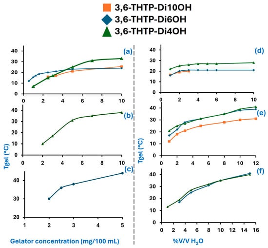 (Left) Plot of Tgel as a function of 3,6-THTP-DCnOH concentration in (a) methanol, (b) ethanol, and (c) n-hexane. (Right) Plot of Tgel as a function of %V/V water added in mixtures of (d) methanol, (e), ethanol and (f) 2-propanol.