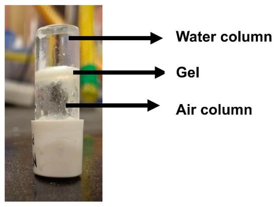 The presence of water in heterogeneous systems, such as hexane–water, did not result in any modification of the behavior of the supramolecular gel in terms of Tgel and minimum gelation concentration. Upon the addition of a specified quantity of 3,6-THT-DiC6OH to a hexane–water mixture, gelation of the organic phase was observed following a heating, stirring, and cooling process, without the formation of a precipitate or the rupture of the gel. In heterogeneous systems comprising predominantly water (80:20 water–hexane systems), the water column is observed in the lower portion (Figure 8). Moreover, when the tube is inverted, the gel demonstrates sufficient stability to support the water column’s weight.