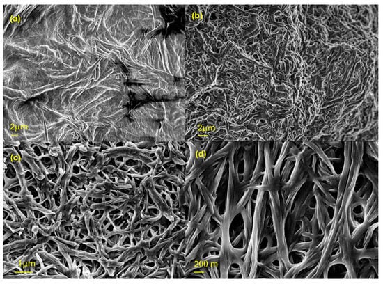 SEM images of 3,6-THT-DiCnOH xerogels obtained from methanol. (a) n = 10, (b) n = 6, and (c) n = 4, and 3,6-THT-DiC6OH in hexane (d).