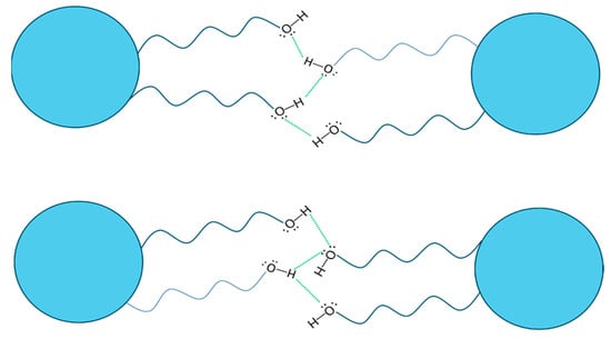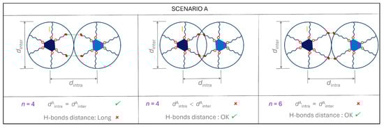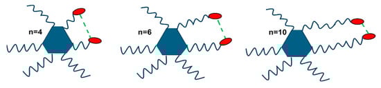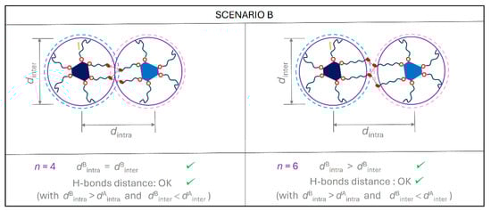 Figure 10 shows three hypothetical situations in the framework of an idealized model (which we called “scenario A”) in which the aliphatic chains radially depart from the core in an extended zig-zag-trans conformation, giving rise to “discs” with diameters which are the sum of that of the triphenylene’s core and the aliphatic chains’ extension. For n = 4, if the disks were “in contact”, the condition dintra = dinter would be fulfilled, but the OH groups would be located at exceedingly long distances to build up H-bonds (Figure 10 left). The formation of such H-bonds would be possible if the two molecules giving rise to the supramolecular dimer approached each other (Figure 10 (middle)). In such a case, however, the condition dintra = dinter will not be fulfilled. For n = 6, the relative extension of both lateral and peripheric chains looks optimal to yield H-bonds; however, the subjacent condition dintra = dinter for “disks in contact” disagreed with the experimental structural results for this compound (Figure 10—right). In other words, none of the idealized situations analysed under the framework of “Scenario A” offer an explanation of the structural results. However, there is neither reason to assume aliphatic chains will adopt a full zig-zag trans conformation nor to limit the intermolecular interaction to just one pair of H-bonds taking place between two aliphatic chains. Actually, the relative orientation of the 3,6-functionalized chains allows the occurrence of multiple connectivity schemes, as usually found in H-bound supramolecular systems, due to the synergistic feature of H-bond interactions. Figure 11 schematically depicts two possible interaction schemes between the hydroxyl groups of the lateral chains of a supramolecular dimer.
