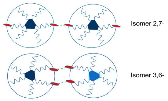 Schematic representation of the hydrogen bond interactions in the 2,7- and 3,6-functionalized isomers (extended lateral vs. localized). Red ovals represent OH groups, dotted green lines represent hydrogen bonds.