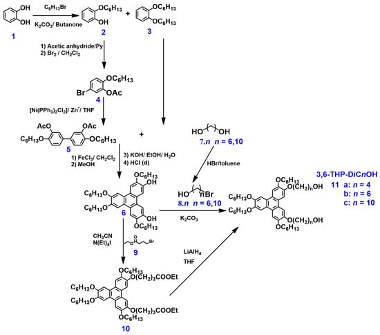 The next two steps (Ullman’s coupling using a nickel catalyst in the presence of powdered Zn, and an oxidative coupling of the acetylated biphenyl with di(hexyloxy)benzene in the presence of ferric chloride) required a strict inert atmosphere and, thus, were performed using either Schlenck techniques or a glovebox. This synthetic sequence yielded a mixture of the expected precursor 6 and its acetylated derivative, which was subsequently subjected to basic hydrolysis. After chromatographic purification in the dark, the 3,6-THTP-DiOH precursor 6 was isolated in low overall yield. The targeted 3,6-THTP-DiC6OH and 3,6-THTP-DiC10OH compounds have been obtained through direct Williamson’s etherification of 6 with the corresponding α,ω-bromoalcohol. For the lightest homologue, we were unable to purify the intermediate compound 8 (n = 4) and then decided to follow an alternative synthetic pathway [], involving etherification with a commercial bromo-ester (9) followed by its reduction to the targeted 3,6-THTP-DiC4OH derivative.