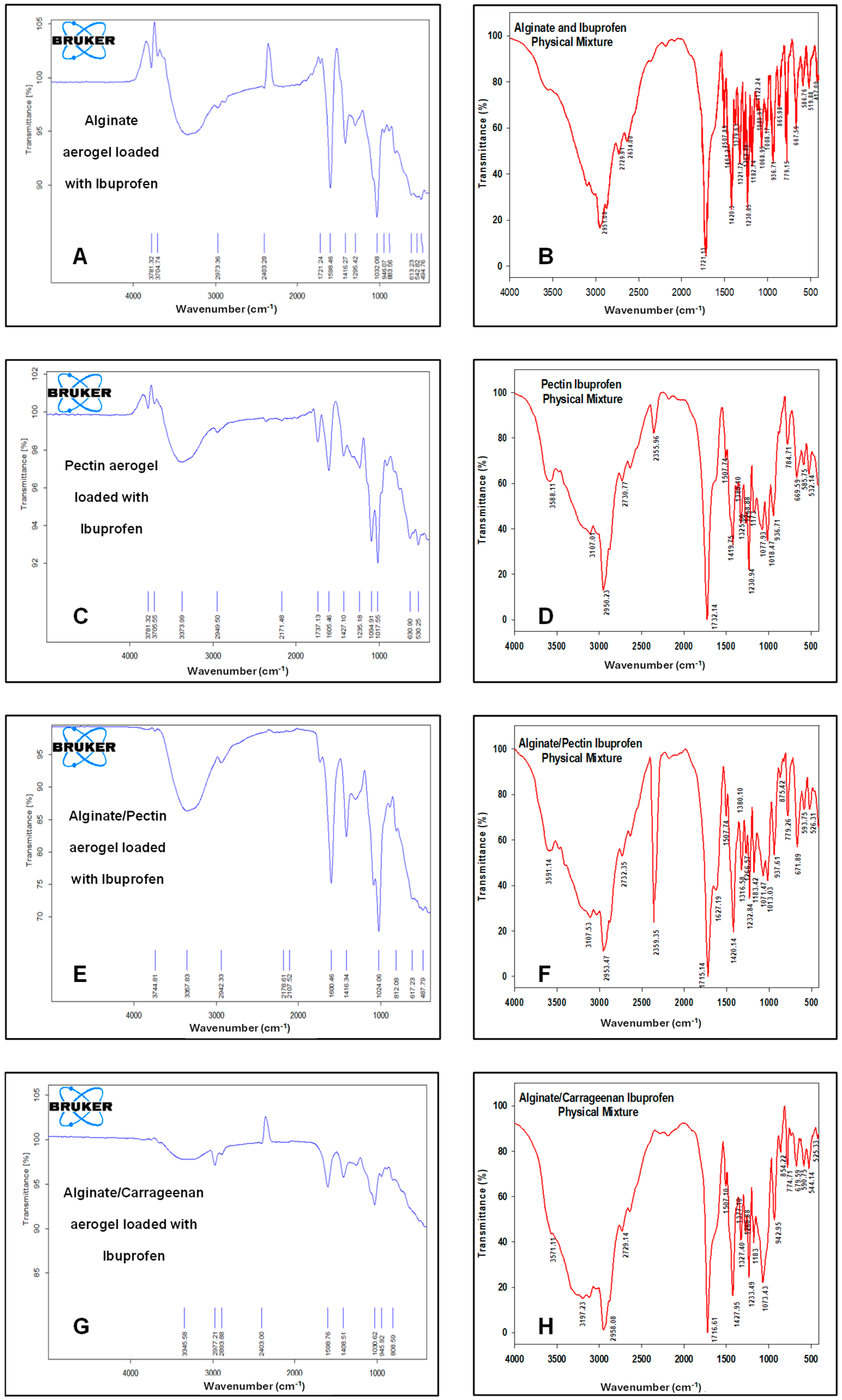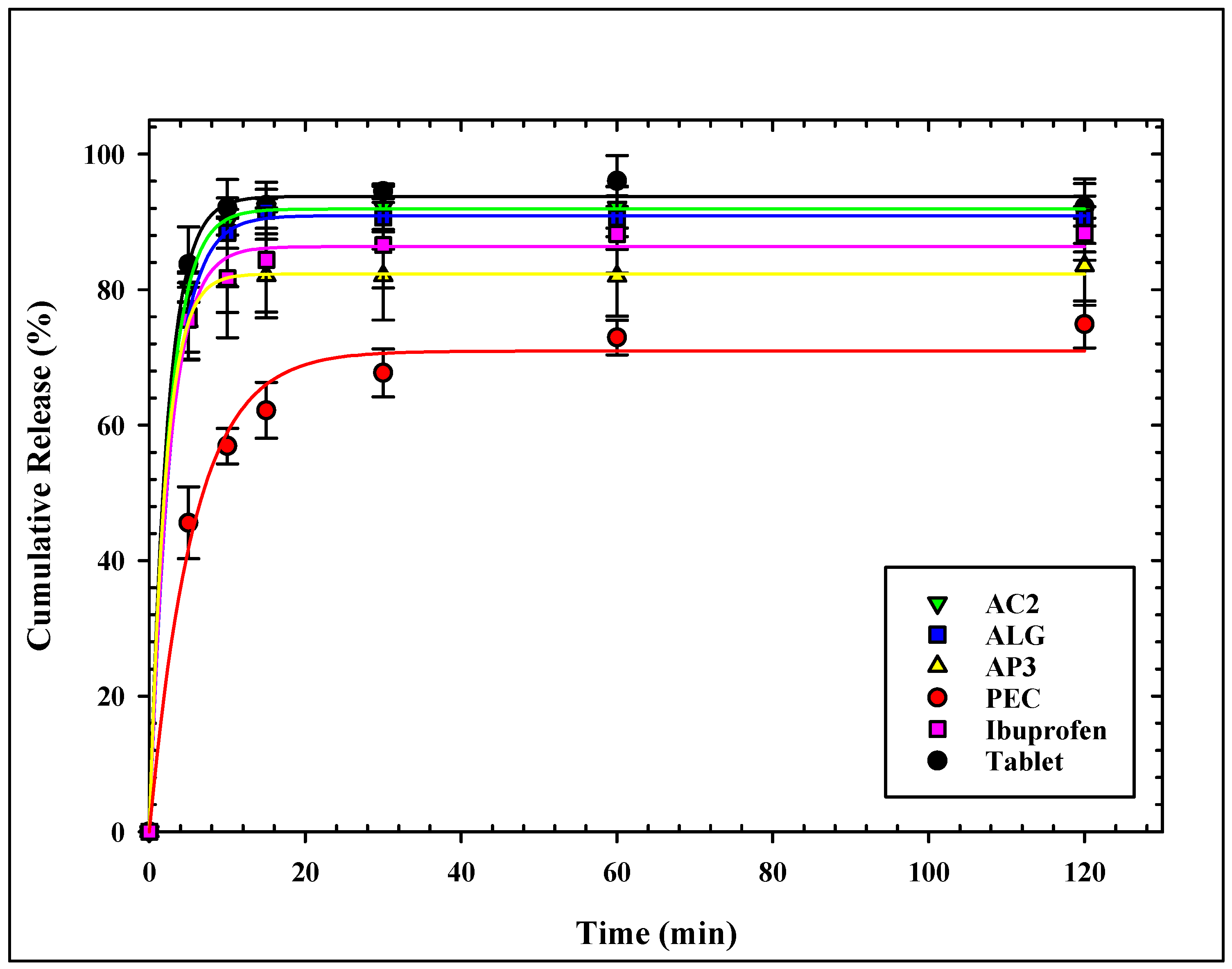4.4. Loading of the Prepared Aerogels with Ibuprofen