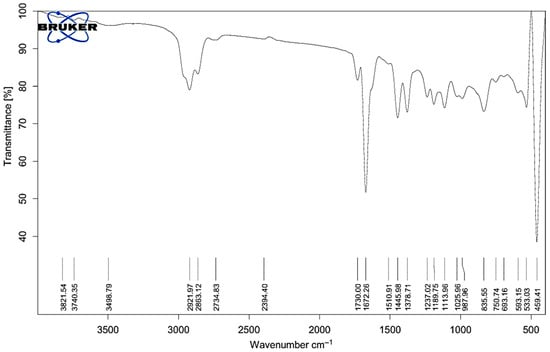 FT-IR spectrum of Melissa oil showing characteristic peaks for functional groups including O–H (3821–3498 cm−1), C–H (2921–2734 cm−1), C=O (1730, 1672 cm−1), C=C and CH bending (1510–1378 cm−1), and C–O (1237–1025 cm−1), confirming the presence of terpenes, esters, alcohols, and phenolic compounds.