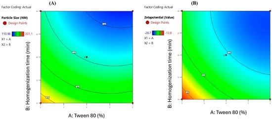 Contour plots depicting the interactive impact of Tween 80 (%) and homogenization time (minutes) on (A) particle size (nm) and (B) zeta potential (mV) of Melissa oil nanoemulsions. The plots demonstrate that increasing Tween 80 concentration and homogenization time significantly reduces particle size and enhances the negative surface charge, indicating improved nanoemulsion stability.