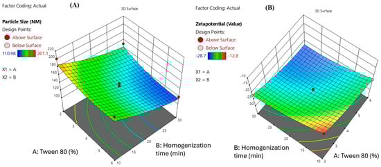 Three-dimensional surface plots illustrating the combined effects of Tween 80 concentration (X1) and homogenization time (X2) on (A) particle size and (B) zeta potential of Melissa oil nanoemulsion. The plots demonstrate that increasing Tween 80 concentration and homogenization time leads to a significant decrease in particle size and a more negative zeta potential, indicating enhanced emulsification efficiency and improved nanoemulsion stability.