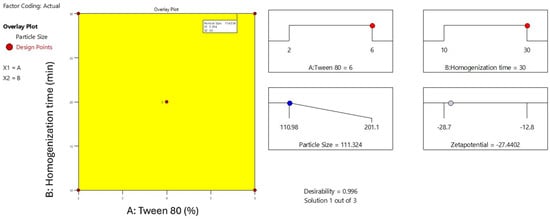 The overlay plot illustrates the optimized formulation space for minimizing particle size in the Melissa oil nanoemulsion by adjusting Tween 80 concentration (X1) and homogenization time (X2) (Figure 4). The highlighted yellow area represents the design space where the particle size meets the desired minimum criteria, approximately 114 nm. Red points mark the experimental design runs, with the central point indicating the optimal condition of 5.6% Tween 80 and 30 min homogenization time. This plot emphasizes the synergistic effect of surfactant concentration and homogenization duration on reducing particle size, which is critical for achieving enhanced stability and efficacy of the nanoemulsion. The overlay visualization aids in clearly defining the optimal parameters for formulation development.