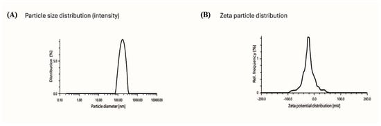 (A) Particle size distribution of Melissa nanoemulsion showing a uniform average diameter of 127.31 nm with a polydispersity index (PDI) of 17.7%, indicating good homogeneity. (B) Zeta potential distribution exhibited a value of −25.0 mV, suggesting adequate electrostatic repulsion and colloidal stability.