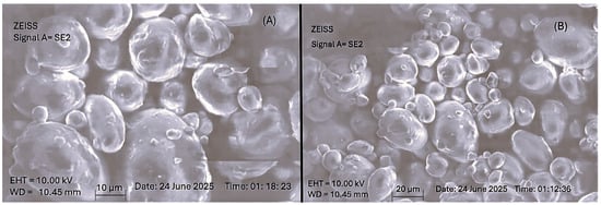 Scanning Electron Microscopy (SEM) images of the optimized Melissa nanoemulsion formulation. (A) SEM micrograph with a 10 μm scale bar reveals spherical droplets with smooth surfaces and uniform morphology. (B) SEM micrograph with a 20 μm scale bar demonstrates homogenous distribution of nanoemulsion particles without significant aggregation, confirming good physical stability of the formulation.