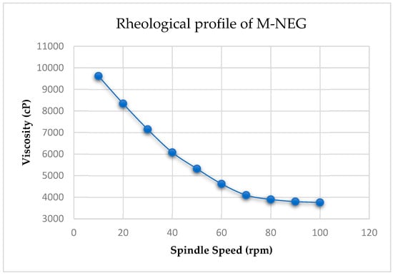 The prepared nanoemulgel was characterized for its macroscopic appearance, rheological behavior, and spreadability to assess its suitability for topical application. Macroscopic evaluation involved visual inspection for color, consistency, clarity, homogeneity, and signs of phase separation or syneresis. The formulation exhibited a smooth, uniform texture and was assessed by manually rubbing a small amount between two clean glass slides. Rheological behavior was evaluated using a Brookfield viscometer (Model LV-DV-II+, Brookfield Engineering Labs, Massachusetts, USA) fitted with spindle number 64 at 25 ± 1 °C. Viscosity measurements were recorded at spindle speeds ranging from 10 to 100 rpm. For each speed, readings were performed in triplicate (n = 3) and the mean viscosity ± standard deviation (SD) was calculated []. The results were graphically presented as a viscosity vs. spindle speed curve with error bars (±SD), and capped ends were used to represent variability across replicates. This ensured clear visual interpretation of the formulation’s flow behavior. Spreadability was determined using the glass slide method, where 0.5 g of gel was placed between two glass slides and compressed with a 500 g weight for 5 min. The diameter of the circular spread area was measured in centimeters. While spreadability (S) can be calculated using the formula