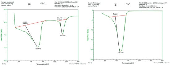 DSC thermograms of Melissa officinalis oil (A) and Melissa-loaded nanoemulgel formulation (B). The oil shows two thermal transitions representing evaporation of volatile and stable components, whereas the nanoemulgel exhibits a single broad transition indicating successful encapsulation and thermal stabilization of the oil within the gel matrix.