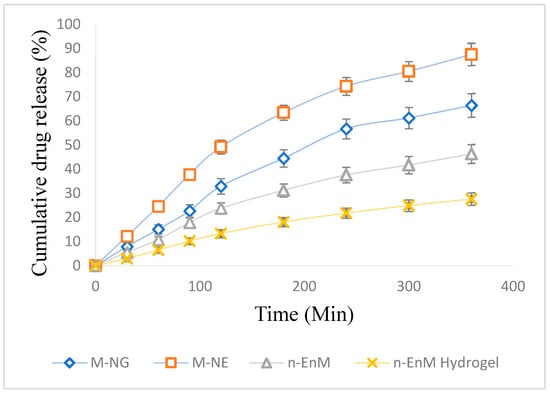 Percentage of cumulative drug release from various Melissa oil formulations over time, expressed as mean ± standard deviation (n = 3). The release curves for M-NG, M-NE, n-EnM, and n-EnM Hydrogel illustrate variations in drug release kinetics between the different formulations. Error bars represent standard deviation, indicating the extent of variability in the release patterns.
