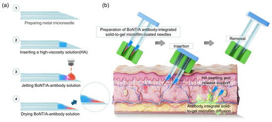 Illustration of solid-state antibody fabrication and application overview. (a) Fabrication of the BoNT/A antibody-integrated solid-to-gel microfilm-coated metal needles (23G; inner diameter 340 μm, outer diameter 640 μm). (b) Overview of strategies for applying the antibody-integrated solid-to-gel microfilm-coated needles. (HA: hyaluronic acid).