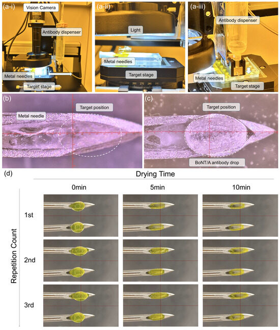 (a-i–a-iii) Custom-built jetting equipment incorporating a vision system for metal needle positioning and real-time monitoring of droplet applications. (b) Metal needle prior to antibody loading, with half of the needles prefilled with HA gel. (c) Deposition of anti-BoNT/A antibody solution droplets onto the needle tips using the automated dispenser. (d) Time-dependent drying dynamics of the antibody solution at 0, 5, and 10 min, demonstrating solvent evaporation, capillary-driven conformal filling of the needle cavities, and the eventual formation of solidified antibody structures with a concave, coffee-ring morphology after three repeated droplet applications. (HA: hyaluronic acid).