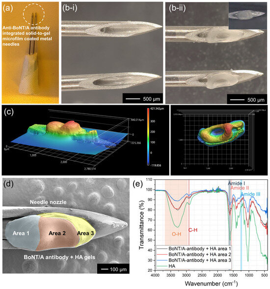 (a) Optical image of metal needles uniformly coated with solidified HA gel and anti-BoNT/A antibodies. (b) Microscopic images of the needles before (b-i) and after (b-ii) antibody loading, showing the ring-shaped deposition of solidified anti-BoNT/A antibodies induced by the coffee-ring effect during drying. (c) Three-dimensional confocal microscopy of the solidified antibody structure. (d) SEM images of HA gel and solidified anti-BoNT/A antibody microfilm on a metal needle, divided into area 1 (blue), 2 (red), and 3 (yellow). (e) FTIR analysis of solidified HA and anti-BoNT/A antibodies. Characteristic HA peaks include OH stretching (2900–3600 cm−1), CH stretching (~2800 cm−1), and Amide I, II, and III bands (1650 cm−1, 1550 cm−1, 1240 cm−1).