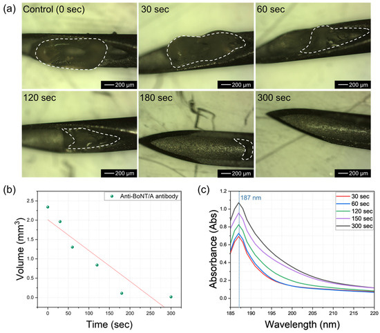 To evaluate dissolution kinetics, the anti-BoNT/A antibody-integrated solid-to-gel microfilm-coated needles were immersed in phosphate-buffered saline (PBS) at 37 °C for defined time intervals (30, 60, 120, 180, and 300 s). At each time point, the degree of antibody dissolution and the residual volume were quantified. Ultraviolet–visible spectroscopy (UV–vis; Perkin Elmer, Springfield, IL, USA) was employed for the quantitative analysis of antibody release. UV–vis spectroscopy with a 1 cm cuvette pathlength was employed to monitor antibody dissolution at 187 nm (and additionally at 280 nm), with measurements taken at 30, 60, 120, 180, and 300 s.