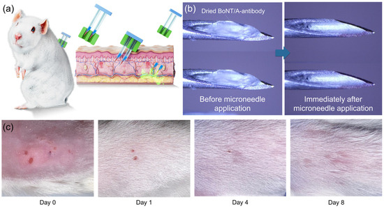 The in vivo applicability of the BoNT/A antibody-integrated solid-to-gel microfilm-coated needles was confirmed in a mouse model. As illustrated in Figure 5a, the antibody-coated needles were applied to the dorsal skin of mice for 5 min to evaluate skin delivery and tolerability. Previous studies have demonstrated the protective efficacy of humanized anti-BoNT/A antibodies in liquid form [14], whereas our work establishes that the same protective outcome can be achieved with a solid-to-gel formulation that additionally offers logistical and practical advantages. Prior to use, the solid-to-gel microfilm exhibited a uniform antibody coating (Figure 5b, left). After removal, the coating was absent, indicating complete dissolution and release into the skin within 5 min (Figure 5b, right). This observation is consistent with the in vitro dissolution kinetics shown in Figure 4 and demonstrates rapid in vivo release. Local skin examination revealed only minor puncture marks immediately after application (Figure 5c), with no bleeding, erythema, or edema. The marks resolved within 24 h, and the skin fully recovered within 4–8 days without evidence of necrosis or inflammation. These findings confirm that anti-BoNT/A antibody-integrated solid-to-gel microfilm-coated needles are well tolerated and biocompatible in vivo.