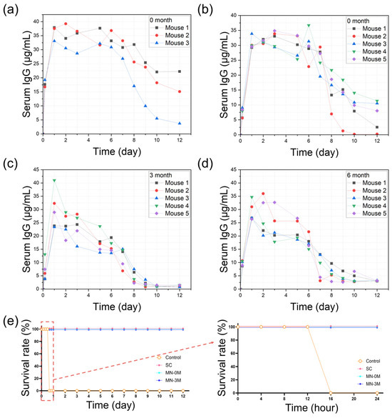 Pharmacokinetics and protective efficacy of anti-BoNT/A antibody-integrated solid-to-gel microfilm-coated needles. (a) Peripheral blood antibody concentrations following conventional subcutaneous injections of liquid antibodies (n = 3). (b–d) Peripheral blood antibody concentrations after delivery of solidified antibody stored for zero, three, or six months in ambient temperature, respectively (n = 5). (e) Survival analysis in a mouse BoNT/A challenge test, demonstrating protective efficacy of conventional subcutaneous injections of liquid antibodies (SC) and solid-state antibodies (stored for zero or three months in ambient temperature) compared with untreated controls. Survival of mice was observed at 4 h intervals up to 24 h, and then at 1-day intervals up to 12 days. The right panel shows detailed survival rates within 24 h. (Red box and arrow: 24-h observation results graph area).