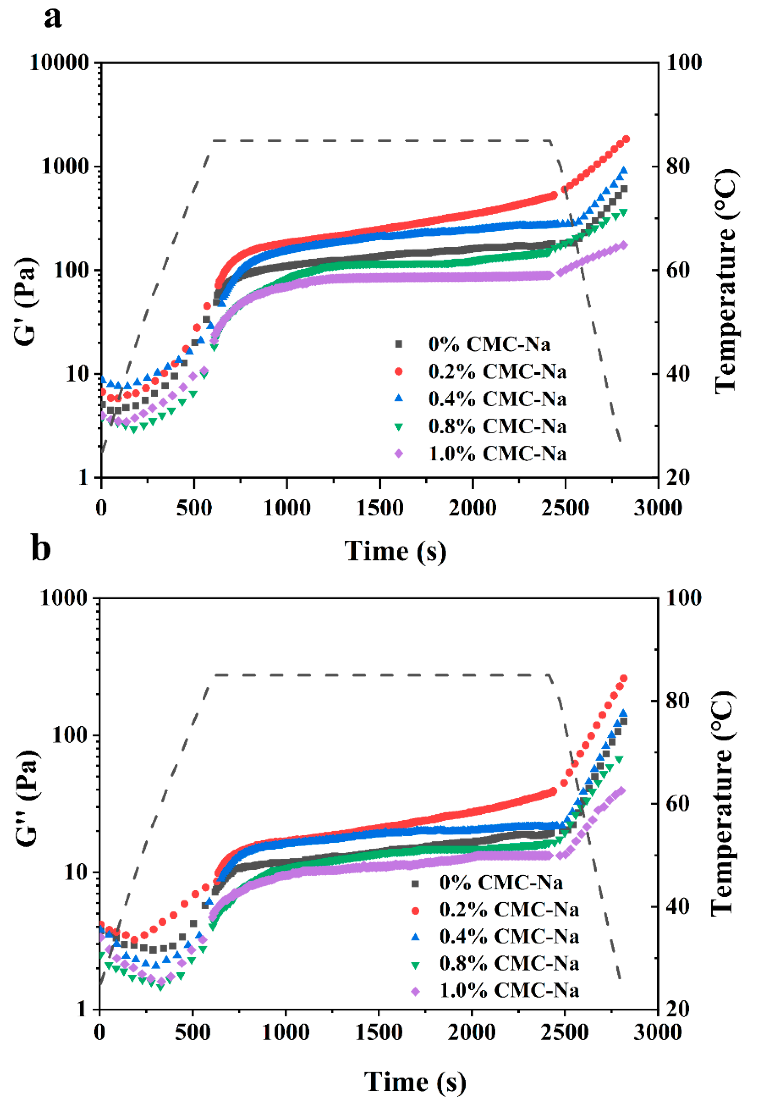 CMC-Na Addition (%) | Final G′ (Pa) | Final G″ (Pa) | Final Tanδ |