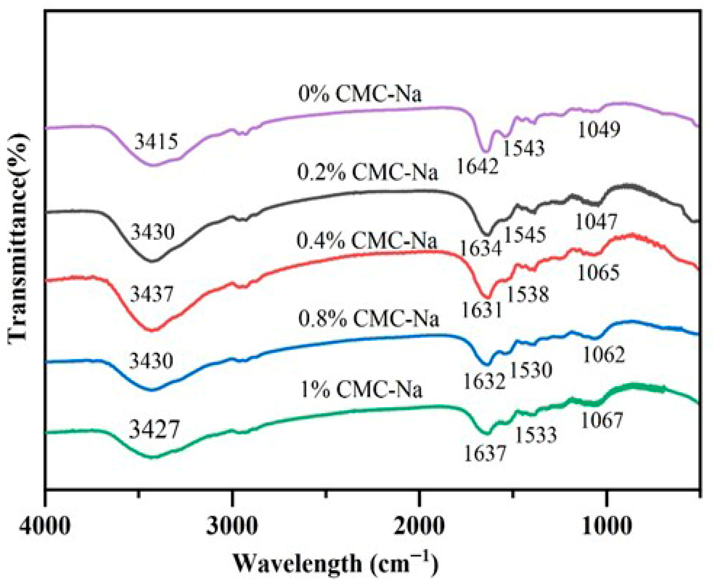 2.2. FTIR of OVA/CMC-Na Composite Gels