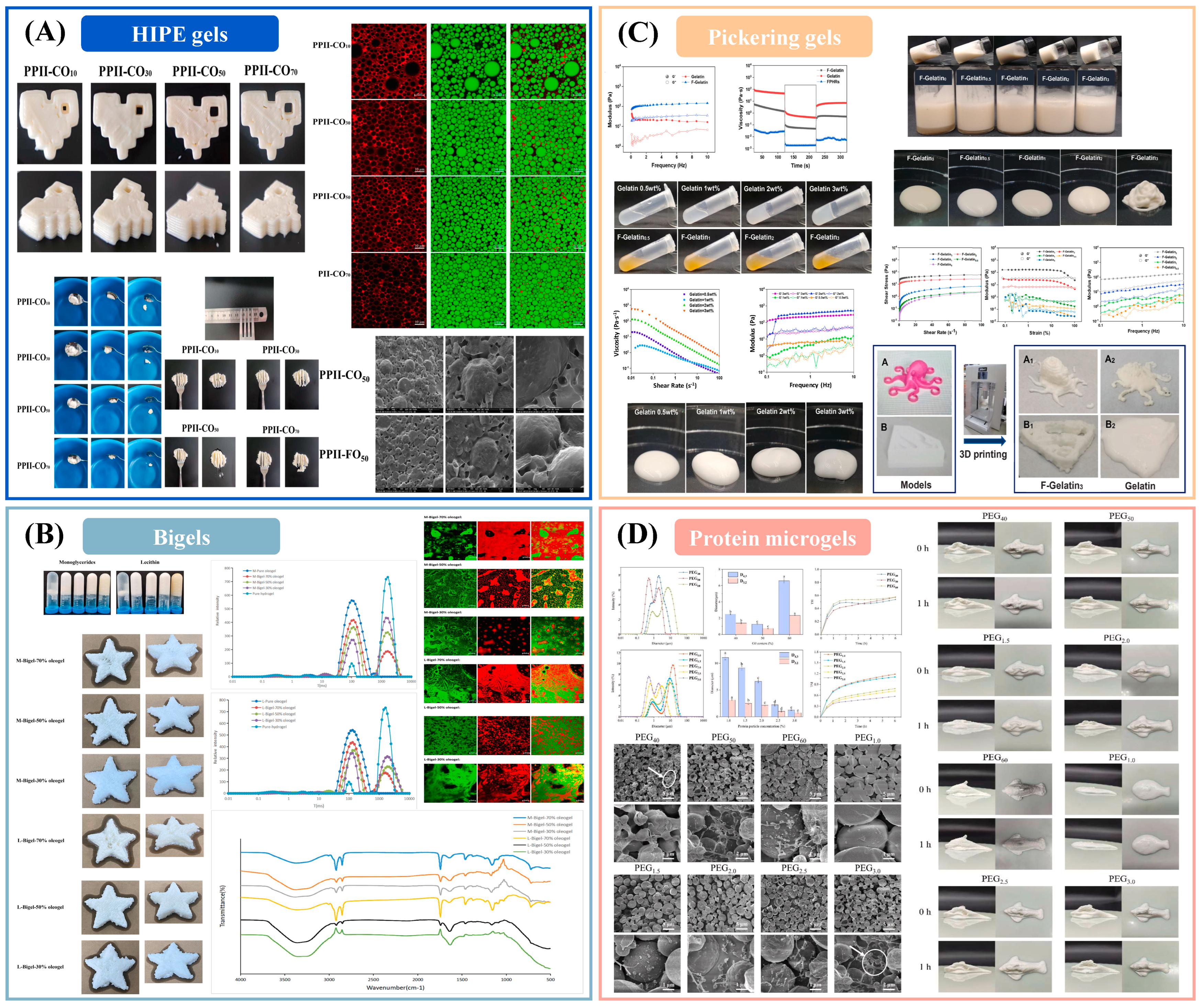 - Xie, D.; Hu, H.; Huang, Q.; Lu, X. Development and Characterization of Food-Grade Bigel System for 3D Printing Applications: Role of Oleogel/Hydrogel Ratios and Emulsifiers. Food Hydrocoll. 2023, 139, 108565. [Google Scholar] [CrossRef]