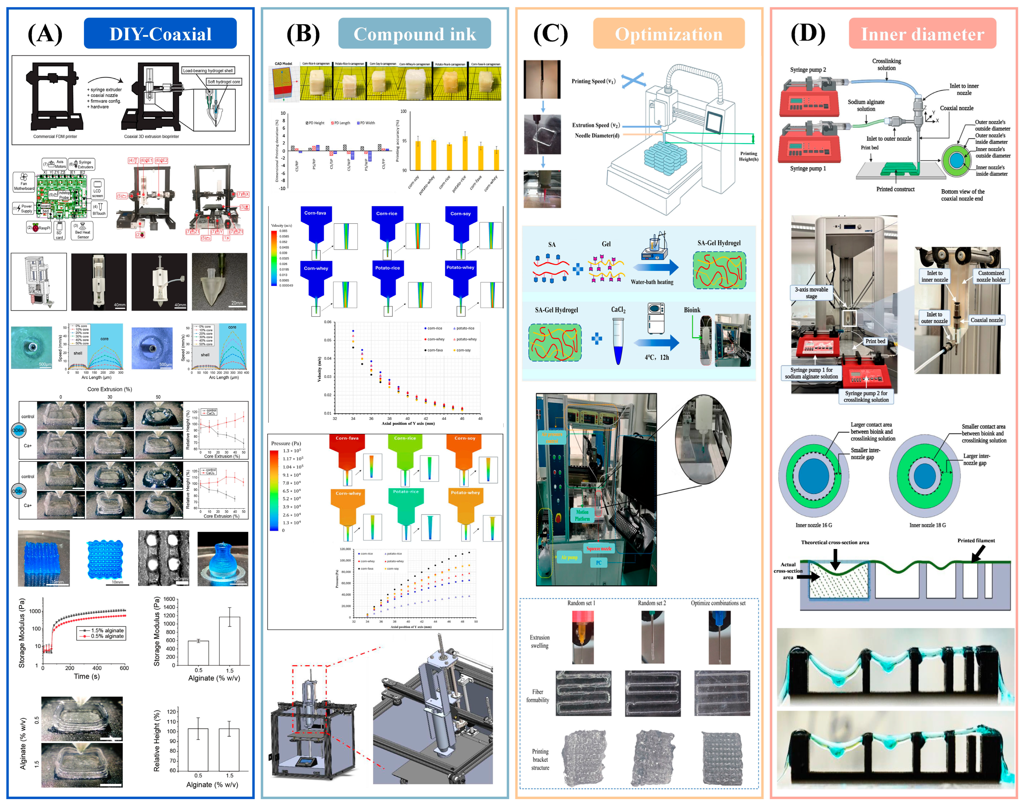 - Rahman, T.T.; Rahman, A.M.; Pei, Z.; Wood, N.; Qin, H. Effects of Coaxial Nozzle’s Inner Nozzle Diameter on Filament Strength and Gelation in Extrusion-Based 3D Printing with In Situ Ionic Crosslinking. Biomimetics 2024, 9, 589. [Google Scholar]