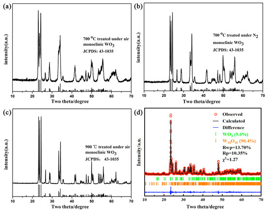 Figure 1 shows the XRD patterns of tungsten oxide obtained from various temperatures in air or N2 atmosphere. It was important to distinguish that only the XRD pattern of tungsten oxide obtained at 900 °C under N2 atmosphere was different from that of three other tungsten oxide samples. At the lower annealing temperature of 700 °C, the XRD patterns of products show monoclinic WO3regardless of the air or N2 condition, which matches well with the JCPDS No.43-1035. The XRD pattern of tungsten oxide obtained at 900 °C under air condition shows sharper diffraction peaks than that of samples obtained at 700 °C. This is due to the improved crystallinity of the tungsten oxide at higher temperature. Meanwhile, XRD pattern of tungsten oxide obtained at 900 °C under N2 condition shows that monoclinic W18O49 matches well with the JCPDS No.71-2450. This large amount of oxygen vacancies is caused by lattice oxygen escaping and WO6 octahedron unit cell rearrangement under inert atmosphere at high temperature. The appearance of the product shows a dark blue which is also widely different from that of other three samples. However, the Rietveld refinement shown in Figure 1d reveals that there were some monoclinic WO3 (JCPDS No.43-1035) existing in the obtained W18O49 (JCPDS No. 71-2450). The residual amount was less than 10%, which demonstrates the successful transformation to the oxygen-deficient tungsten oxide W18O49.