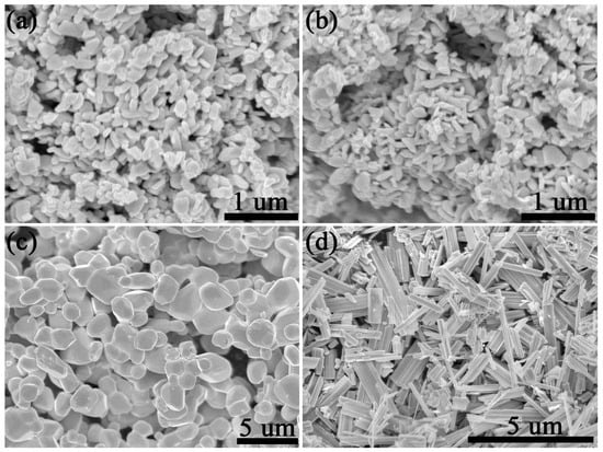 SEM images of tungsten oxide. (a) 700 °C air, (b) 700 °C N2, (c) 900 °C air, and (d) 900 °C N2.