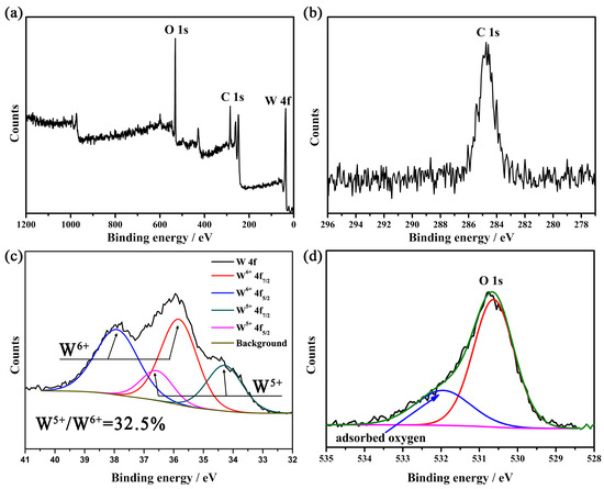 (a) XPS survey of tungsten oxide obtained at 900 °C in N2, (b) C 1s, (c) W 4f, (d) O 1s.
