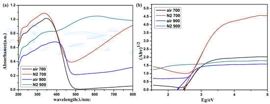 The appearance of these tungsten oxides obtained in various conditions was extremely varied. The reduced tungsten oxidation state (W5+) is often regarded as the color center in tungsten oxide. Therefore, the oxygen-deficient product exhibits a dark blue appearance which differs from that of other tungsten oxides. The optical characterization was converted from diffuse reflectance spectrum by Kubelka–Munk transformation. As shown in Figure 4a, the green line shows a broad absorption during the whole UV-Vis range while the products obtained at 700 °C show only a slight absorption during the visible light range. The red line also exhibits partial absorption in visible range due to its increased crystallinity. The partial red light absorption results in a green appearance of this tungsten oxide powder. The band gap of these tungsten oxides was calculated according to the absorbance. As shown in Figure 4b, the black line and red line represents the sample obtained at 700 °C, demonstrated to be a similar band gap of about 2.5 eV [7,33]. The blue line shows a smaller band gap due to its higher crystallinity. A more orderly arrangement of WO6 units causes more absorbance. However, the strong absorbance during the whole UV-Vis range of W18O49 comes from its high concentration of free carries. These results are similar to the previous reported research; the light absorption capability increases with the increment of free carriers in transition metal oxide semiconductor [34]. A self-floating evaporator with a stable photothermal conversion performance of W18O49 coupled with carbon foam has been reported and applied in solar steam generation [35]. Here, a fine-designed hydrophilic gel was adopted to play a crucial dual role as a “water channel” and “thermal barrier” so as to significantly increase the evaporation efficiency.