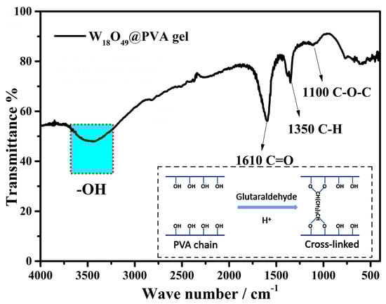 Figure 5 shows the FTIR spectrum of the composite gel. The PVA chains are rich in hydroxyl groups, which could be cross-linked by glutaraldehyde in acid condition and results in the formation of a three-dimensional interpenetrating network structure [24]. The dialdehyde molecule with a head-to-tail structure is often used to cross-link the long chain polymer with hydroxyl groups [36,37,38]. As PVA dissolves in hot water, the viscosity of the system gradually increases. Therefore, inorganic nanomaterials can be dispersed better in this system to avoid coagulation during the cross-linking process. Thus, this liquid-to-gel process is easy to scale up and costless for preparing the composite gel. This interconnected PVA structure could serve as a thermal barrier in ISSG evaporators due to its low thermal conductivity. Moreover, it also reserves partial hydroxyl groups (as shown the strong absorption at ~3500 cm−1). This reservation of hydroxyl groups ensures its hydrophilicity which is critical to the water transportation in ISSG technology. Therefore, the composite gel plays a crucial dual role as a “water channel” and “thermal barrier” in ISSG evaporators due to its unique three-dimensional network structure.