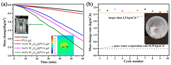 In order to boost water evaporation efficiency, a fast water supply to the evaporation surface is especially important. Therefore, a hydrophilic network such as PVA should be introduced into the structure of the evaporator. PVA hydrogel could play a crucial dual role as a “water channel” and “thermal barrier” in ISSG evaporators due to its unique three-dimensional network structure [19,20,21,22,23]. Firstly, the PVA network rich in hydroxyl (-OH) groups exhibits strong hydrophilic nature, enabling rapid absorption of water from the underlying layer through capillary forces. Its porous structure provides continuous and low-resistance transmission channels for water molecules, ensuring continuous and sufficient water supply to the evaporation interface and preventing local drying. Secondly, the PVA polymer backbone itself is a poor conductor of heat. The heat generated inside the gel can be used to provide the latent heat required by internal water molecules during evaporation, effectively limiting the diffusion of heat to the bulk of the water body and efficiently “locking” the thermal energy at the evaporation interface, significantly improving heat utilization efficiency [24]. Furthermore, PVA hydrogel possesses excellent flexibility, biocompatibility, and processability (such as freeze–thaw cycling and chemical cross-linking), facilitating the integration of different nanomaterials, and enabling the construction of diversified and adaptable (such as flexible and wearable) evaporator structures. Despite the PPy photothermal conversion material, carbon or another semiconductor with high free carriers (Ti2O3, CuS2−x) is coupled with PVA gel to configure the solar evaporator [20,22,23,25,26,27,28,29]. The morphology of the photothermal conversion material would also impact the solar steam generation performance and the lifetime of the solar evaporator. The preferentially grown W18O49 with one-dimensional structure would twist around the PVA net structure easily. Therefore, ingenious material design and structural optimization of W18O49/PVA composite gel can effectively synergize light harvesting, heat generation, water supply, and thermal management, providing a practical approach to achieve ultra-high evaporation efficiency.