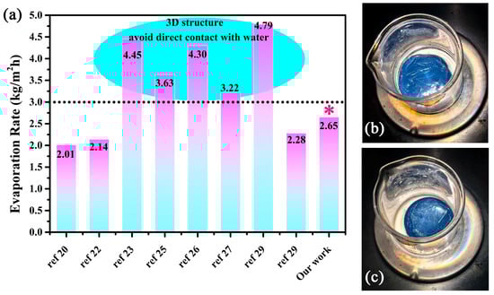 (a) A quantitative comparison of the evaporation rate among the reported solar evaporators. (b) The image of composite gel in 10 wt% salt solution before evaporation. (c) The image of composite gel in 10 wt% salt solution under continuous 6 h irradiation. The asterisk (*) indicates our work.