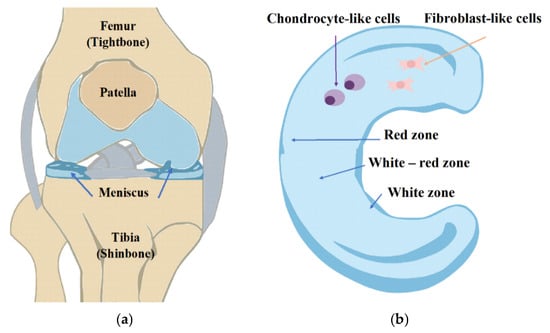 Meniscal injuries are common, often resulting from sports activities, trauma, or degenerative changes in older populations. The meniscus’s unique anatomy consists of three zones, which are differentially vascularized (Figure 1b); thus, a healing response is highly contingent upon the site zone of the tear. Tears in the outer, vascularized zone are more likely to heal, while those in the inner, avascular zone are notoriously resistant to repair []. The conventional treatments for meniscal injury are partial or total meniscectomy, and these can relieve symptoms but raise the risk of eventual degeneration of the joint [,]. Therefore, there has been a developing interest in tissue engineering techniques that attempt to preserve meniscal tissue and promote its regeneration.