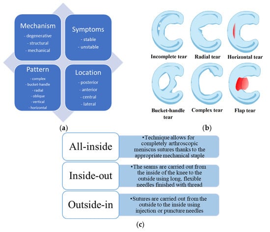 (a) Schematic presentation of meniscus damage classification. (b) Examples of the most common meniscus tears. (c) Basic techniques of arthroscopic operation procedures.