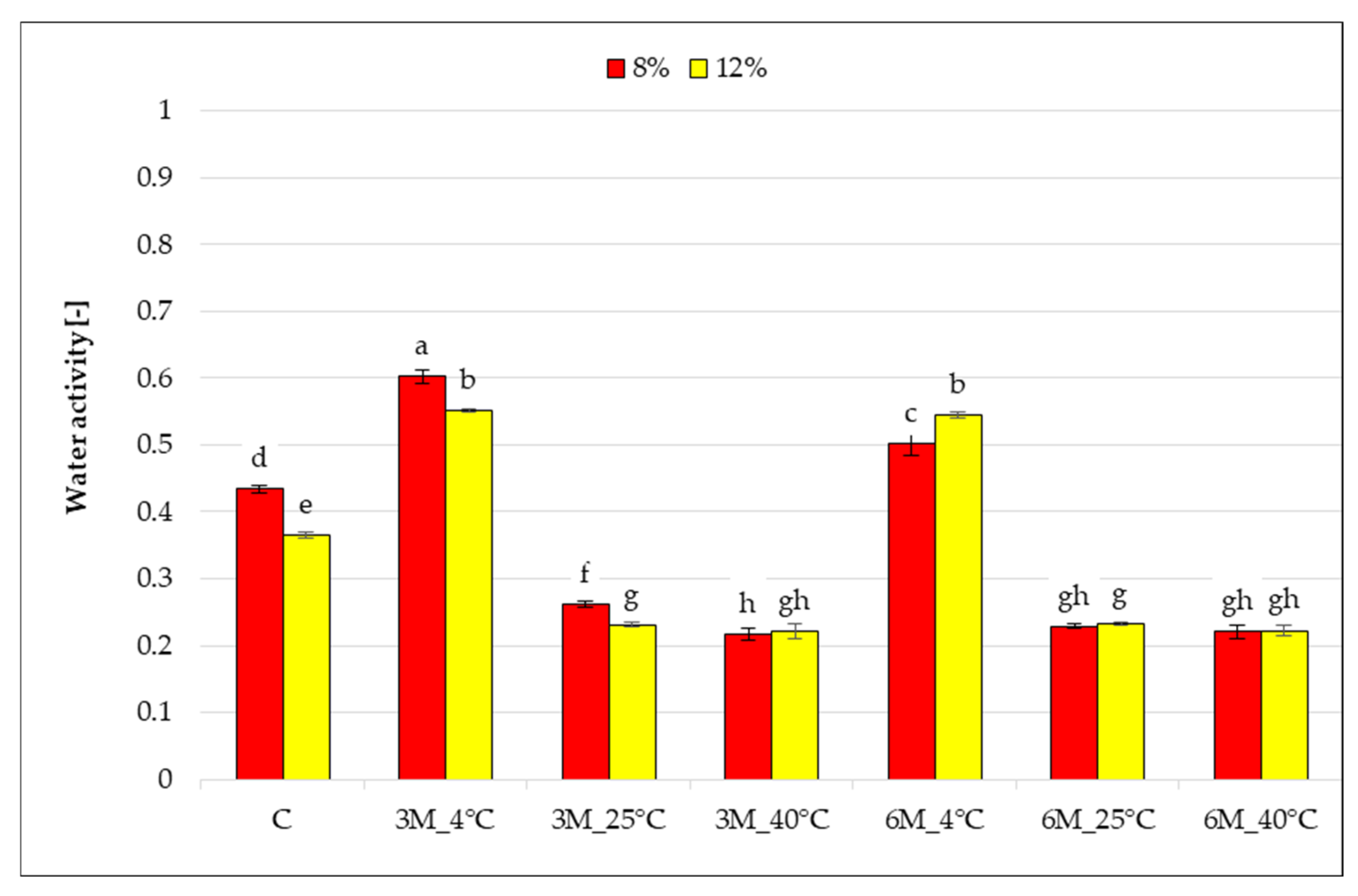 After 3 and 6 months of storage at 4 °C (8%_3M_4 °C, 12%_3M_4 °C, 8%_6M_4 °C and 12%_6M_4 °C), a decrease in dry matter content was noted compared to control samples (C). These results are consistent with the observed increase in water activity (