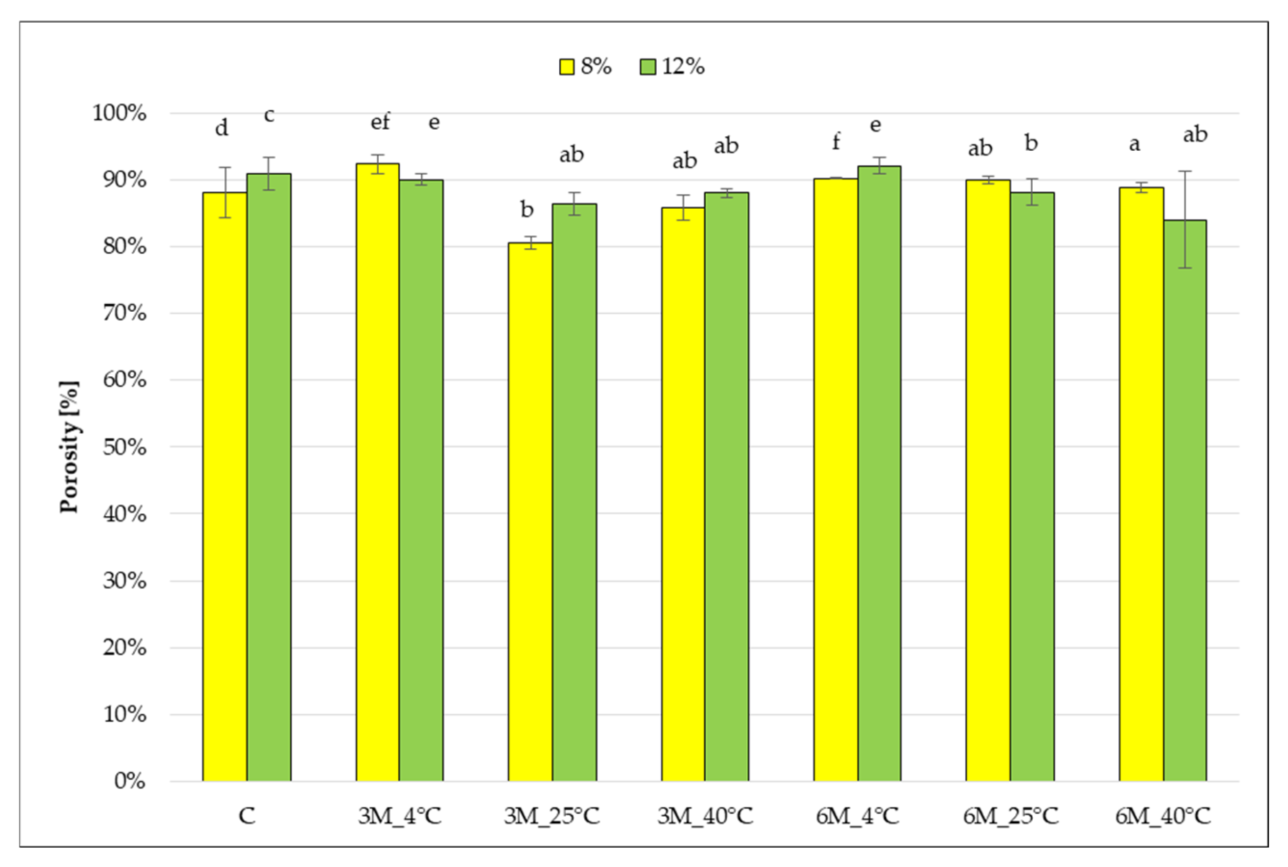 Sample 8%_3M_25 °C showed the highest compressive force values (up to 160 N), which may indicate product drying and significant structure at higher storage temperatures. Also, the lowest porosity value (