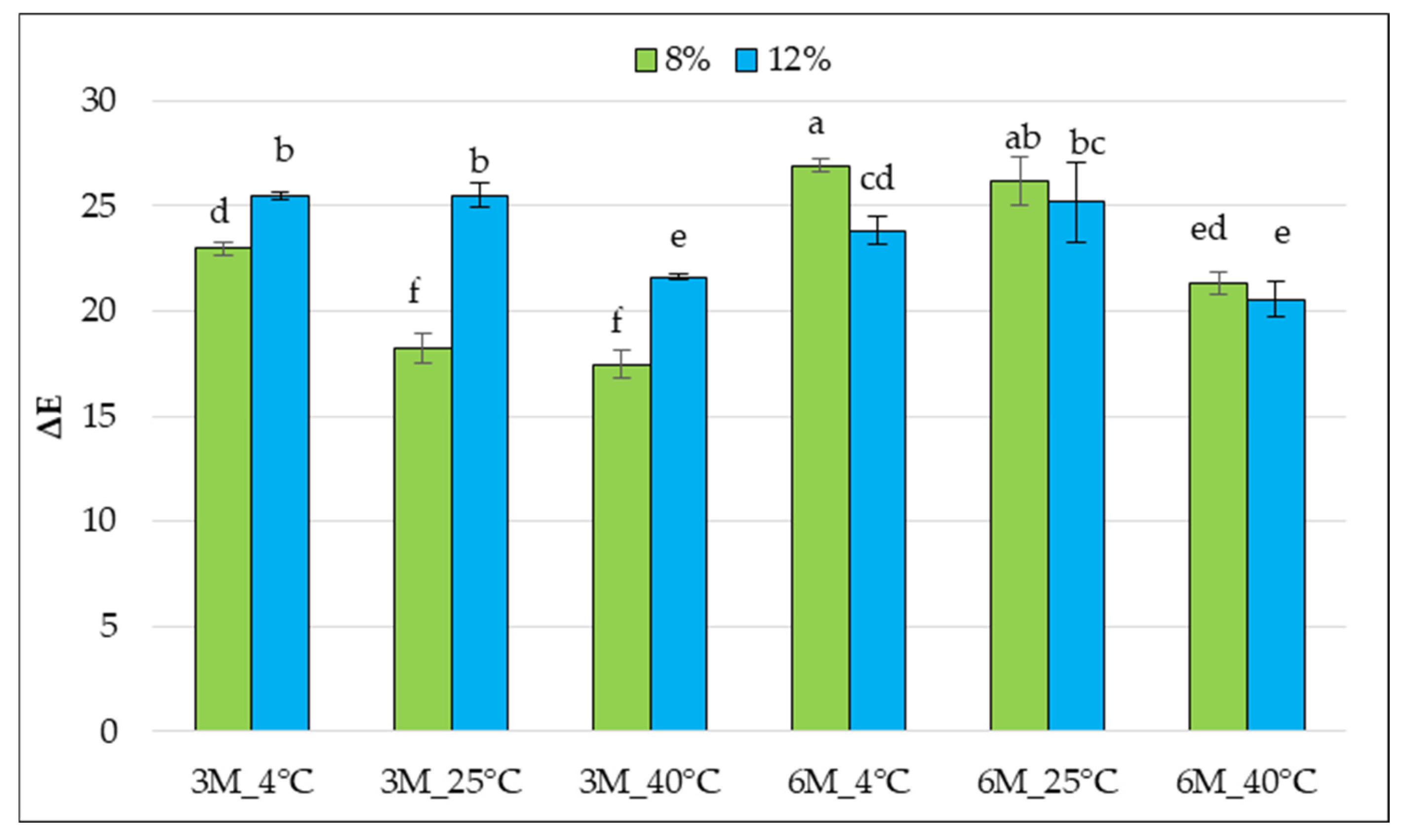 47]. In many cases, higher gelatin concentrations (12%) were associated with greater color changes (higher ΔE). Statistical analysis revealed significant differences between samples stored at 4 °C. The greatest color changes were observed in the 12%_6M_4 °C sample, which may result from unfavorable changes occurring at low temperatures over a more extended period of time, such as carotenoid oxidation at higher water activity. The lowest ΔE values were observed for samples stored at 40 °C, which may suggest some stabilization of the pigments at higher temperatures or more uniform surface darkening. Storage at low temperatures (4 °C) for 6 months was associated with the most significant color changes, especially with higher gelatin concentrations. The 8% gelatin concentration appears to be more favorable regarding color retention, especially for shorter storage times and at higher temperatures. High total color difference ΔE parameters indicate that the color of the samples after storage could be easily distinguished from the control samples, even by an untrained observer.