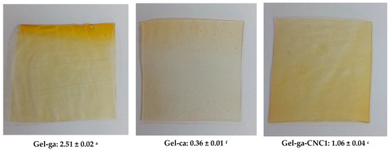 In Figure 2, the opacity values of gelatin-based hydrogels, crosslinked with glutaraldehyde or citric acid and reinforced with cellulose nanocrystals (CNC), are shown. Opacity is defined as the light blocked or absorbed by the film and is inversely related to transmittance [14]. In this context, opacity values show significant differences among the hydrogels depending on the crosslinking agent and the presence of cellulose nanocrystals (CNC). The Gel-ga hydrogel exhibited the highest opacity (2.51 ± 0.02), displaying a yellowish and turbid appearance consistent with its low optical transmittance and high chroma. This is attributed to the formation of dense polymer networks and possible chromophore reactions with glutaraldehyde. This observed behaviour is consistent with the results of [5], wherein UV-Vis spectroscopy revealed pronounced absorption peaks at 200–300 nm and 600 nm upon the introduction of the crosslinking agent. This indicates a marked capacity for light absorption within the hydrogel matrix. The underlying mechanism for this phenomenon is ascribed to a Schiff base reaction, wherein aldehyde groups react with the amino functionalities of CMCS and gelatin, culminating in the generation of a dark yellow pigment. Conversely, Gel-ca displayed the lowest opacity (0.36 ± 0.01) and an almost transparent appearance, resulting from its more open and homogeneous structure. Formulations containing CNC showed intermediate behaviour: Gel-ga-CNC1 (1.06 ± 0.04) and Gel-ca-CNC1 (0.89 ± 0.09), demonstrating that the addition of nanocrystals moderately increases opacity, although this effect is less pronounced when citric acid is used as the crosslinking agent. These results indicate that glutaraldehyde generates higher opacity, whereas citric acid allows the maintenance of high transparency even in the presence of CNC, which is advantageous for applications requiring optical clarity.