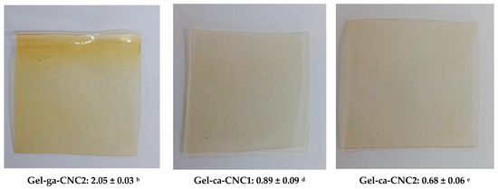 Visual appearance of the films (photographs) and average opacity values ± standard deviation of the analyzed samples. Different superscript letters indicate significant differences (p < 0.05) between formulations.