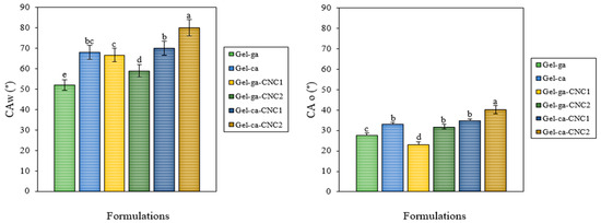 Mean values and associated standard deviations for the water (CAw, °) and oil (CAo, °) contact angles of the investigated films. Different letters indicate significant differences (p < 0.05) between formulations.